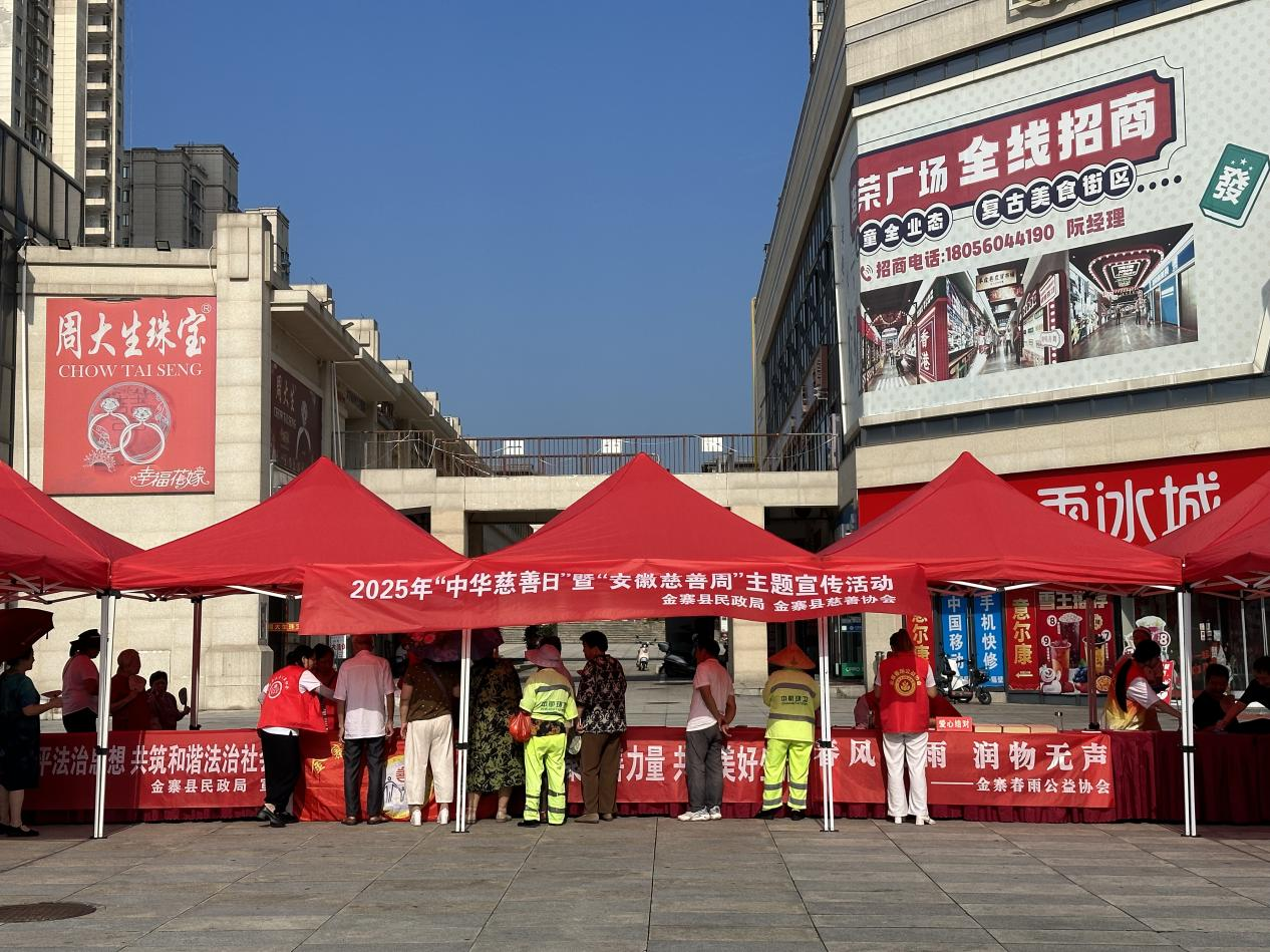 | 9月5日,金寨县民政局、金寨县慈善协会联合县内多家单位及公益性社会组织,在港荣广场组织开展了以“汇聚向善力量,共创美好生活”为主题的第十个“中华慈善日”宣传活动。通过悬挂横幅、摆放展板、发放宣传手册、现场讲解等方式,工作人员及志愿者向过往群众生动解读《中华人民共和国慈善法》及配套法规政策,普及慈善知识,展示金寨县慈善事业发展成果及优秀慈善项目。
